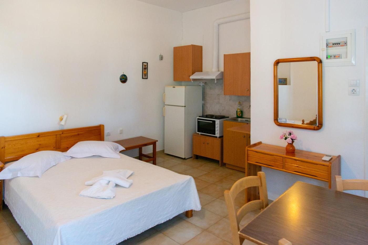 Standard Double Room. Air-conditioned room with a balcony offering distant views of the Aegean Sea.A fridge and TV are included. ;