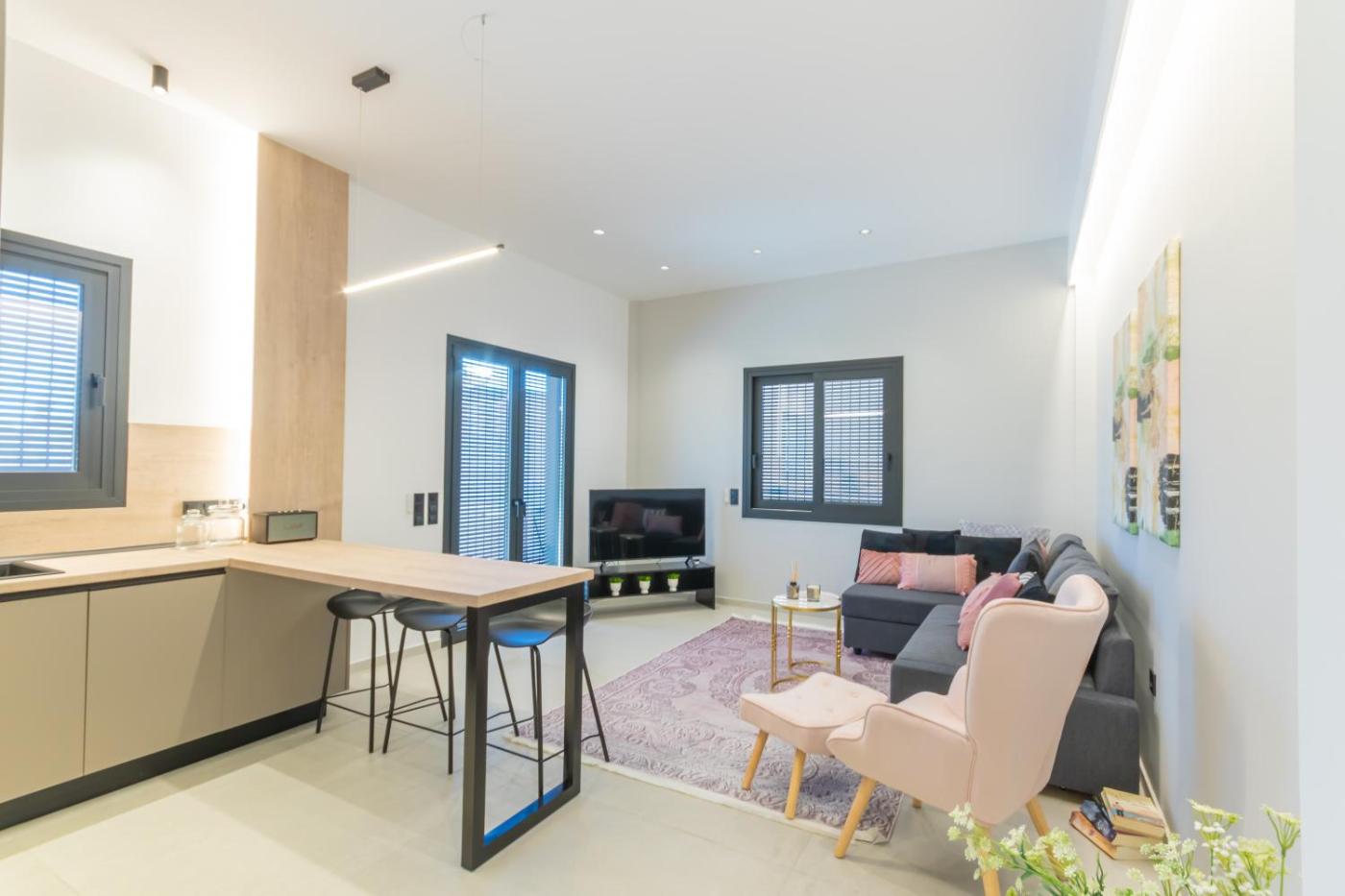 Deluxe King Suite. Featuring a private entrance, this air-conditioned suite consists of 1 living room, 1 separate bedroom and 1 bathroom with a walk-in shower and a hairdryer. The fully equipped kitchen has a stovetop, a refrigerator, a dishwasher and kitchenware. This suite features a washing machine, flat-screen TV, mountain views, as well as winechampagne for guests. The unit offers 2 beds.