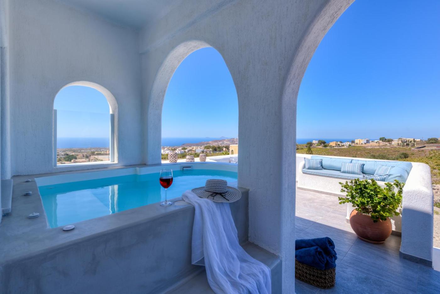 Two-Bedroom Villa. Offering views of the sea and Megalochori Village, this villa features a hot tub and includes: - free WiFi - a fully equipped kitchen with dining area - a living room with a flat-screen TV.