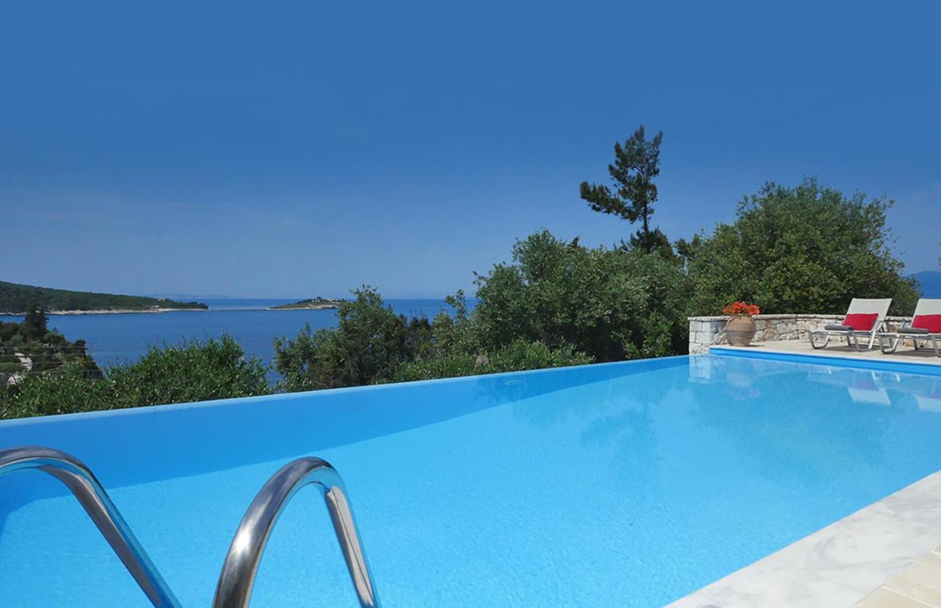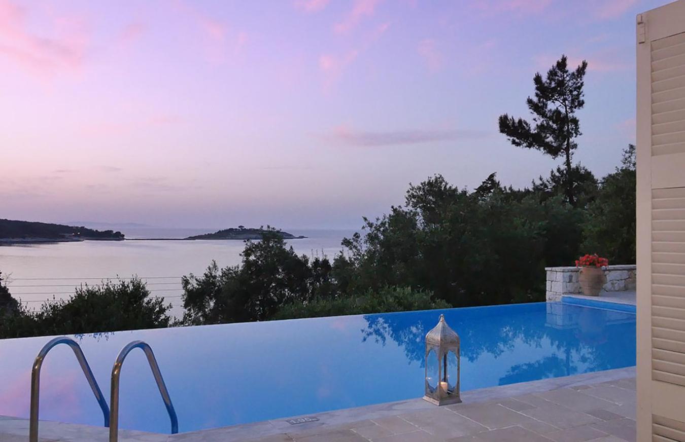 The villa features 1 bedroom, 1 bathroom, bed linen, towels, a TV, a dining area, a fully equipped kitchen, and a patio with sea views. Guests can enjoy a meal on an outdoor dining area while overlooking the pool views.