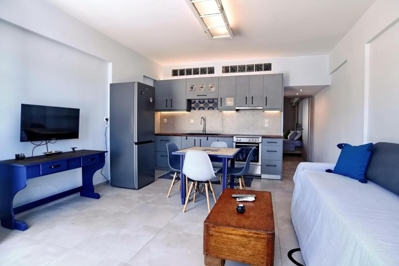 One-Bedroom Apartment. Featuring a private entrance, this air-conditioned apartment comprises 1 living room, 1 separate bedroom and 1 bathroom with a shower and a hairdryer. Meals can be prepared in the well-fitted kitchen, which comes with a stovetop, a refrigerator, kitchenware and an oven. This apartment features a washing machine, flat-screen TV, sea views, as well as winechampagne for guests. The unit offers 2 beds.